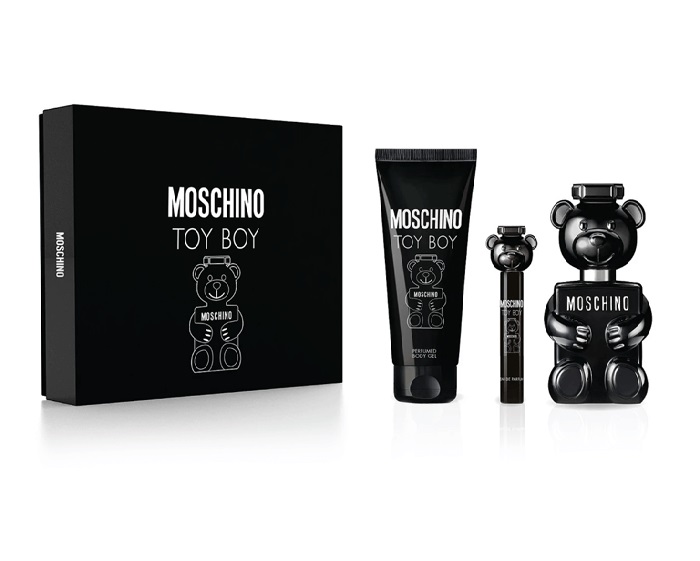 ESTUCHE TOY BOY by Moschino Hombre 4pzs 100ml edt +10ml edt + after shave + gel de baño. Toy Boy de Moschino se lanzó en 2019. La Nariz detrás de esta fragrancia es Yann Vasnier. Las Notas de Salida son pimienta rosa, pera, nuez moscada de Indonesia, elemí y bergamota; las Notas de Corazón son rosa, magnolia, clavo de olor y lino; las Notas de Fondo son vetiver de Haití, cachemira, Sylkolide, sándalo y ámbar.