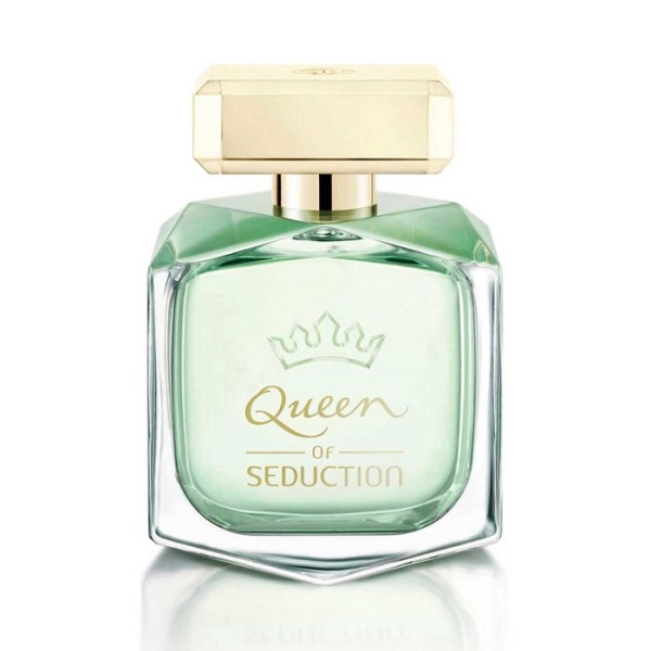Queen of Seduction by Antonio Banderas. Las notas de Salida son: notas acuosas, frambuesa y toronja (pomelo). Las notas de Corazón son: jazmín, peonía, pimienta rosa e iris. Las notas de Fondo son: ámbar, cedro y gamuza.